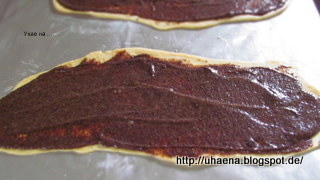 - Намазвам две от корите с маковата смес като оставям около 2 см от всички страни на кората свободни от намазване.