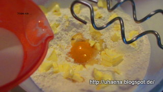 - Добавям към брашното солта, захарта, маслото на малки кубчета, 1 яйце.