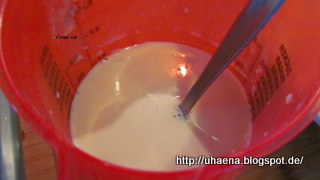 - Започвам да разбивам с миксер, с накрайниците за тесто и да добавям на тънка струйка млякото с разтворената мая.