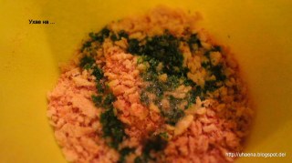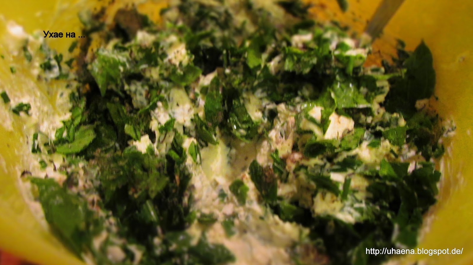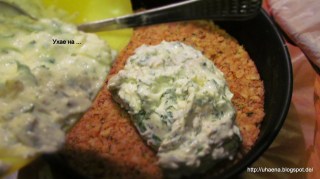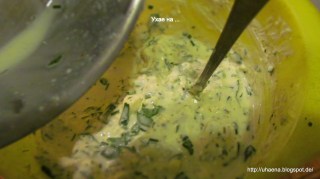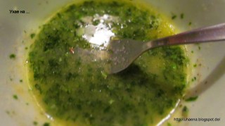 - Маслото разтопявам в микровълновата и подправям с магданоз, джоджен, чесън, лук. Със солта трябва да се внимава, заради сирената.