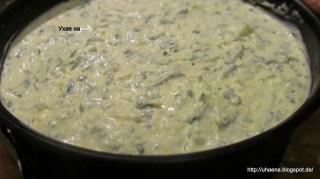- В купа свесвам изварата, крема сиренето и натрошеното краве сирене. Разбърквам. Добавям всички зелени подправки, спанака и джоджена. Подправям на вкус. Сол не добавям, но това Ви сами ще прецените.