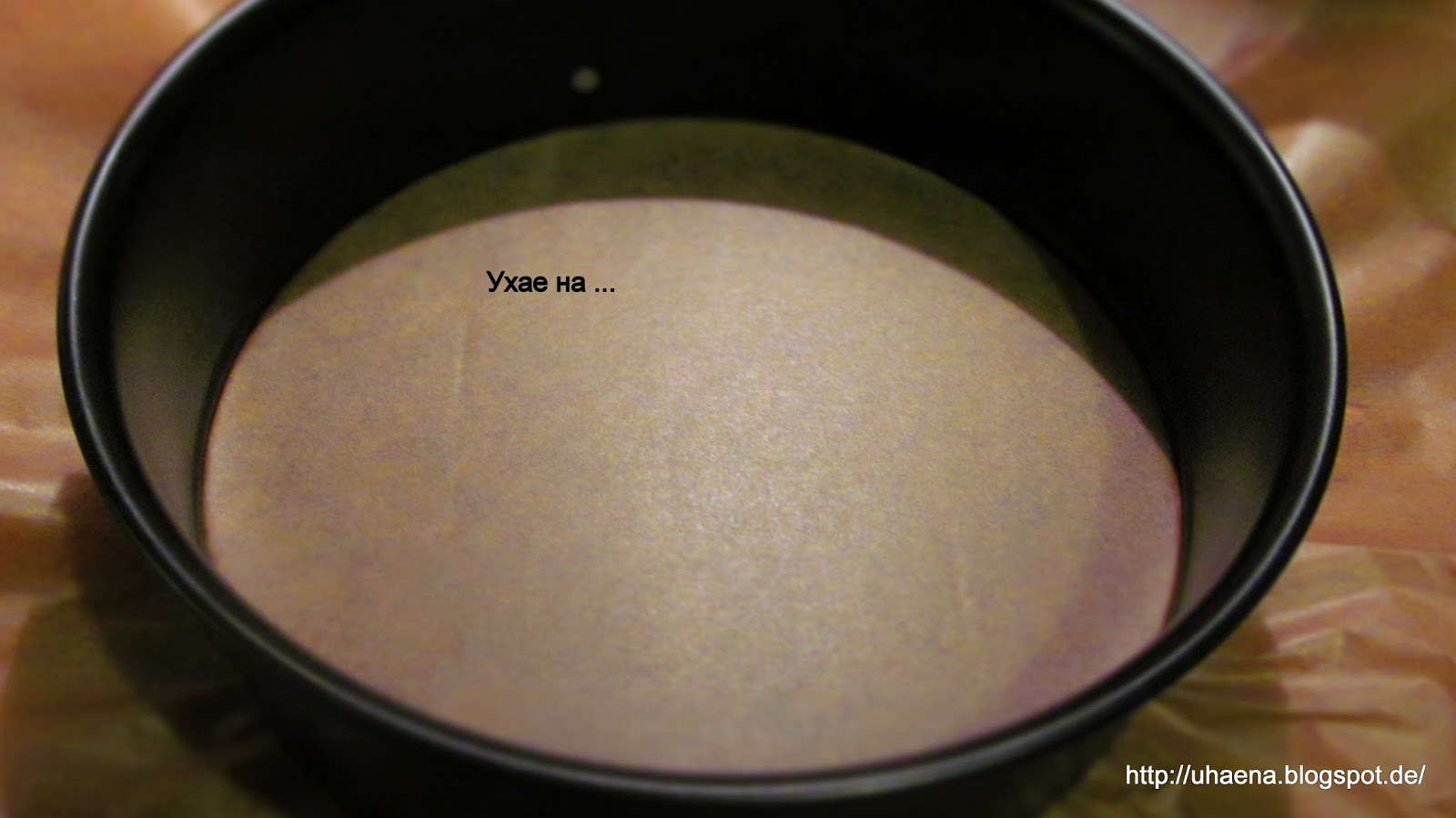 - Слагам хартия за печене на форма за торта с размер 20 см. Хартията е за по-удобно пренасяне на готовата торта. Можете да замените и с фолио за свежо съхранение.