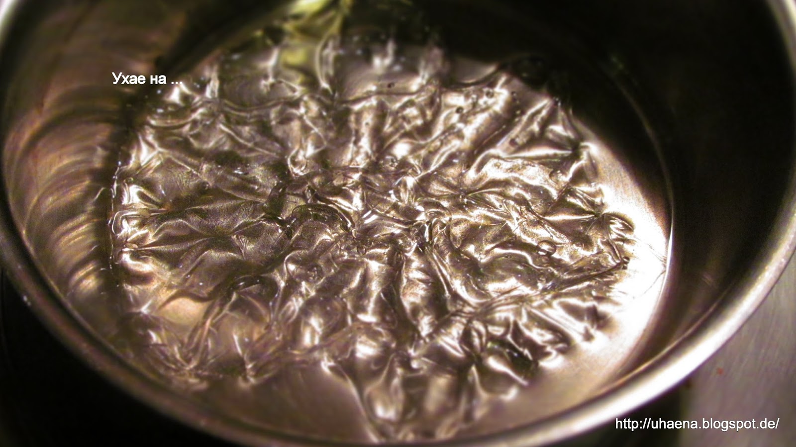 - Двата листа желатин накисвам с малко студена вода, колкото да ги покрие. Изчаквам леко да набъбне желатина и загрявам на котлона до пълното разтопяване на желатина.