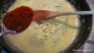- Добавям червения пипер, разбърквам и веднага заливам със 100 мл зеленчуков бульон.