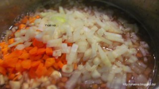 - Всички зеленчуци нарязвам на ситно и добавям към къкрещата леща. Котлонът е на средна мощност.