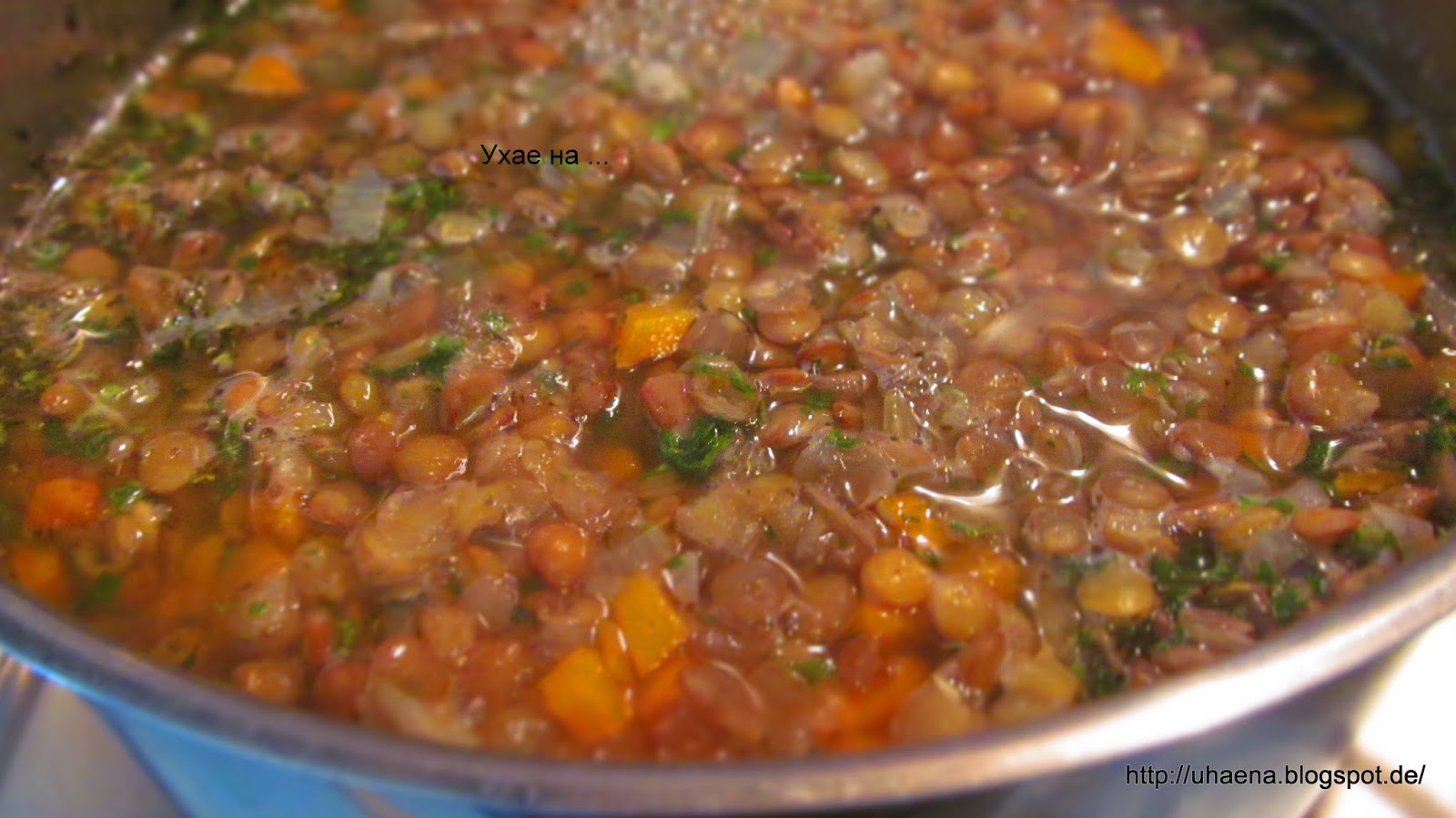 - Всички зеленчуци нарязвам на ситно и добавям към къкрещата леща. Котлонът е на средна мощност.
