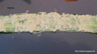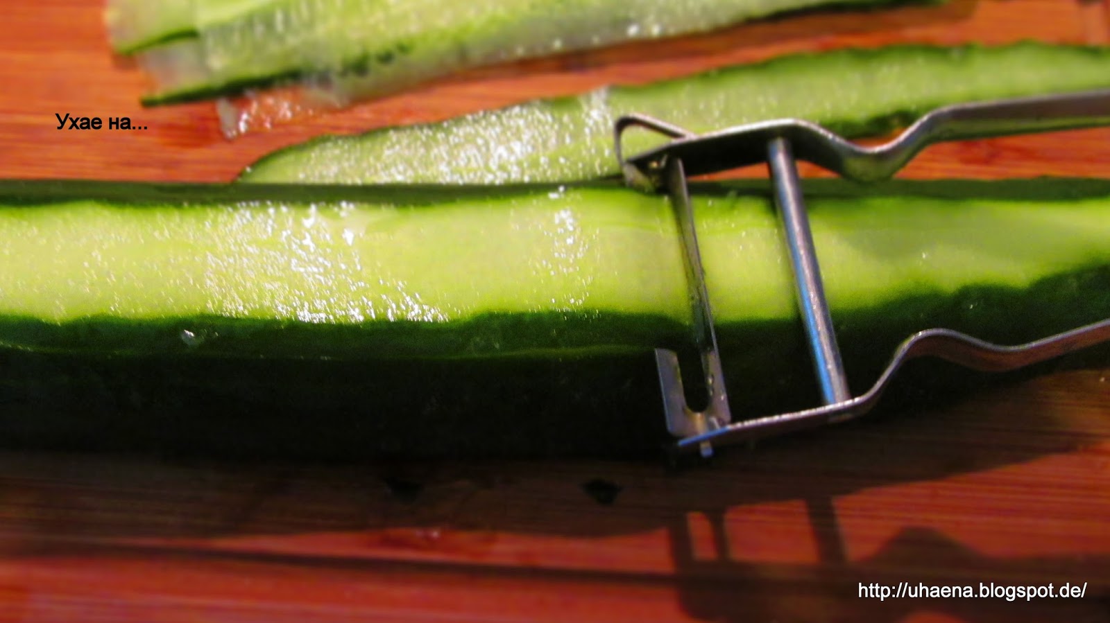 - Измивам краставицата и с помощта на белачката изрязвам 6 тънки ленти от нея