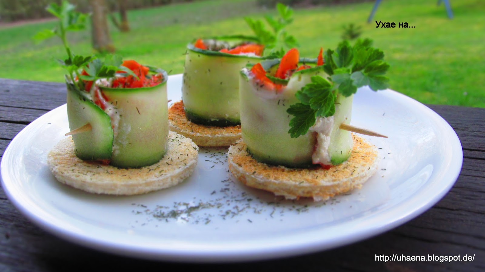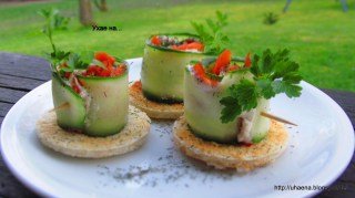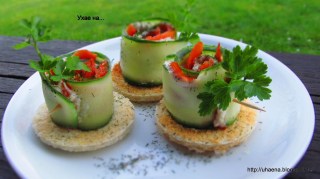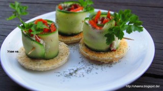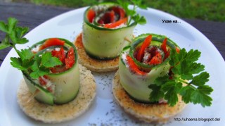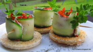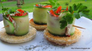 Ето още едно много лесно и интересно предястие. Съчетанието на свежа краставица, филийки пушена сьомга, хрянова паста и филийки хляб за тостер си остава класика. А поднесени по този ефектен начин – спират дъха!