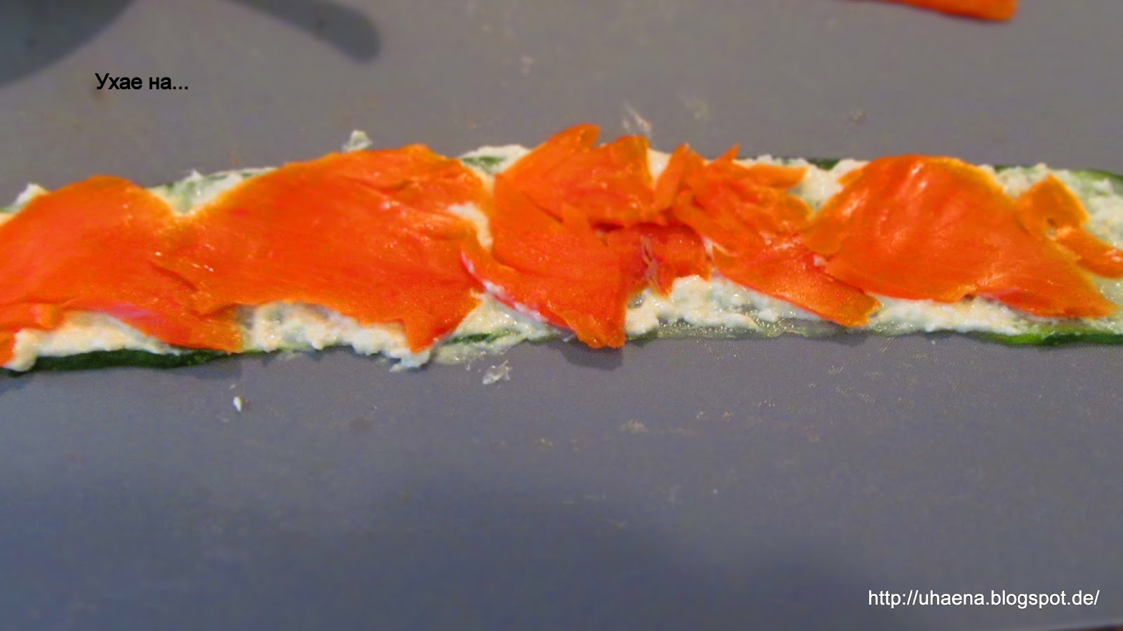 - Върху хряновата паста подреждам лентички от пушената сьомга и поръсвам със ситно нарязан копър.