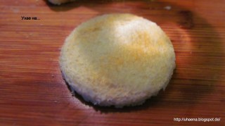 - Изпичам хляба на тостер и още докато е топъл изрязвам с чаша кръгчета с размер 5 см.