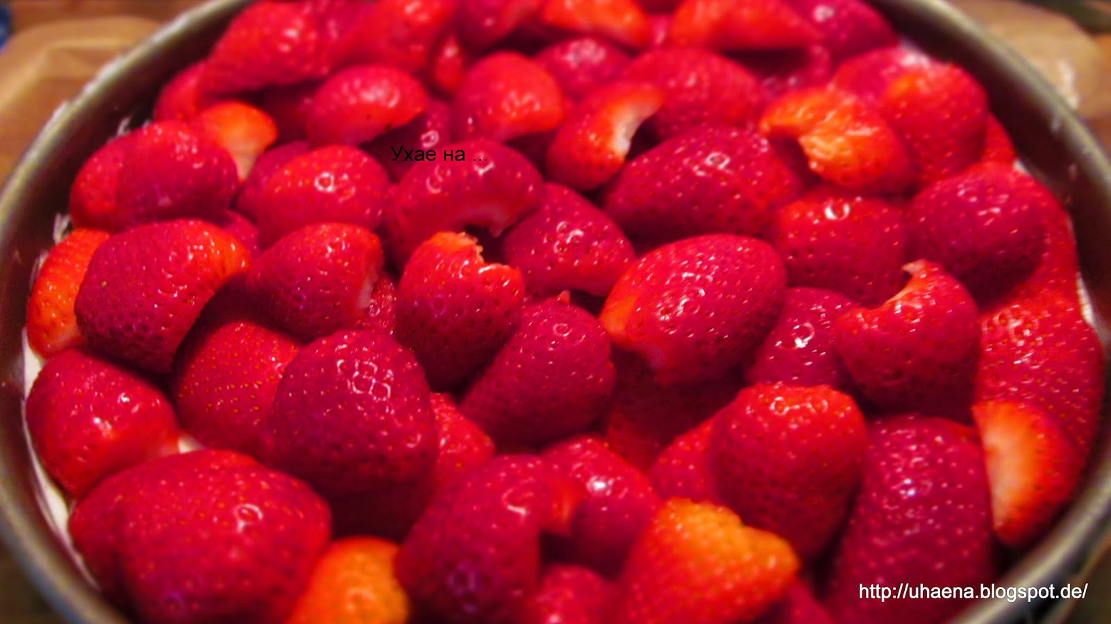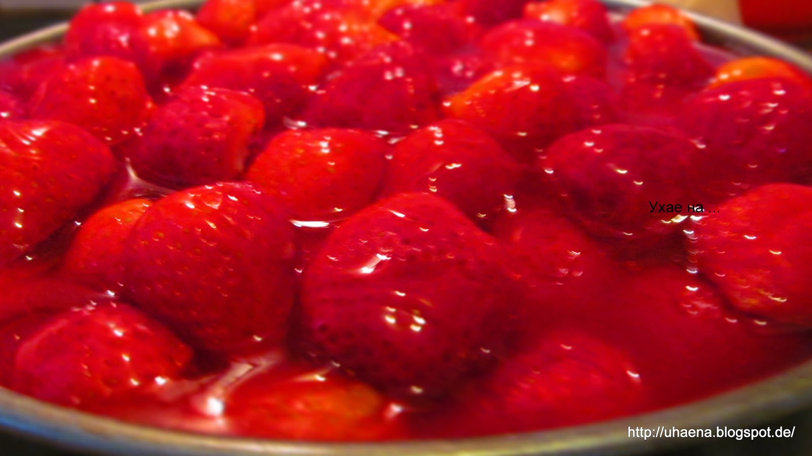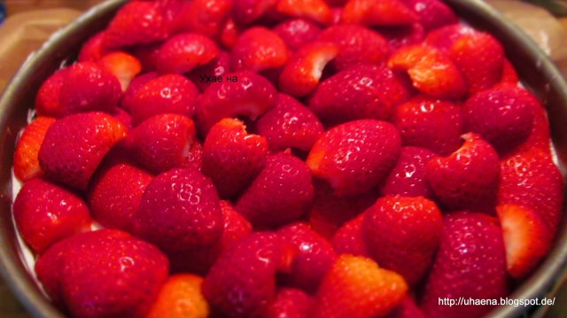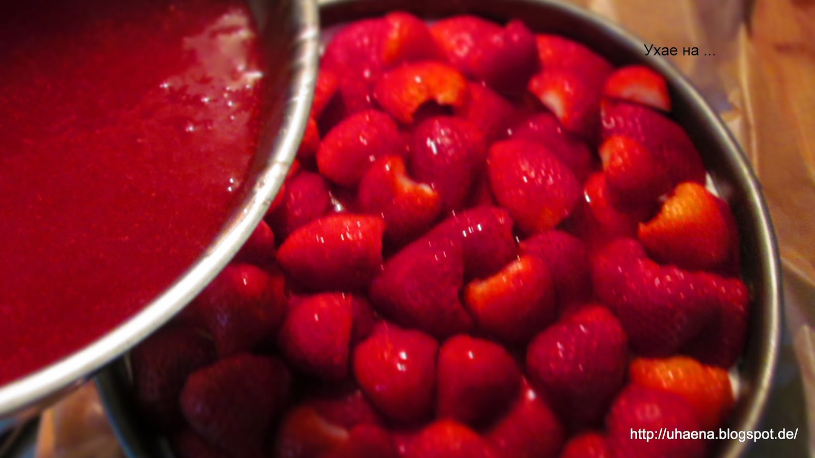 - Когато желето започне да се сгъстява изсипвам равномерно върху ягодите.