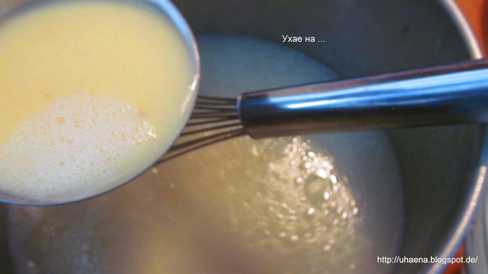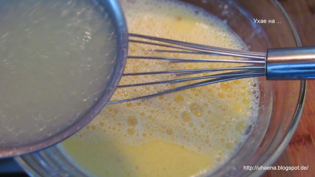 - Добавям от бульона малко по малко към разбитите яйца, докато се изравни температурата им.