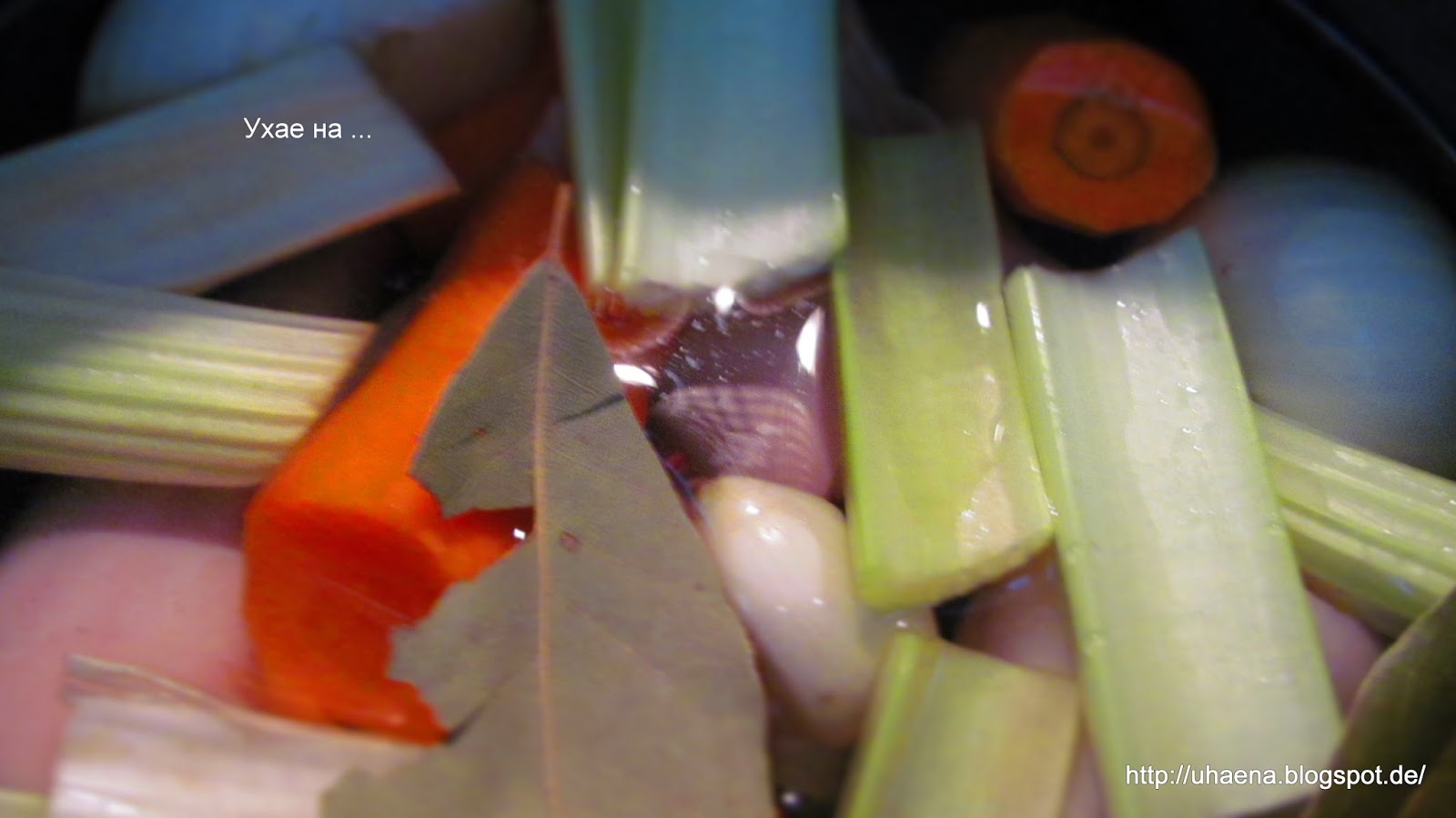 - Добавям почистената глава лук – цяла, обелените моркови – цели, стеблата селери, отрязани на дълги парчета, дафиновите листа и 2 скилидки от чесъна.