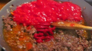 - Добавям доматеното пюре, доматите и бульона.