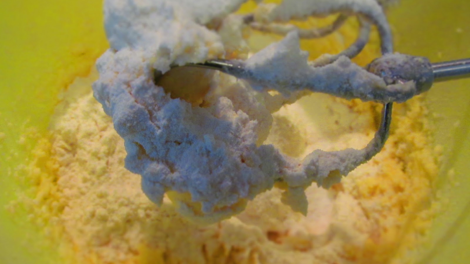 - Пресявам брашното и бакпулвера. Добавям на няколко пъти към маслено-яйчения крем и разбивам за кратко с миксер.