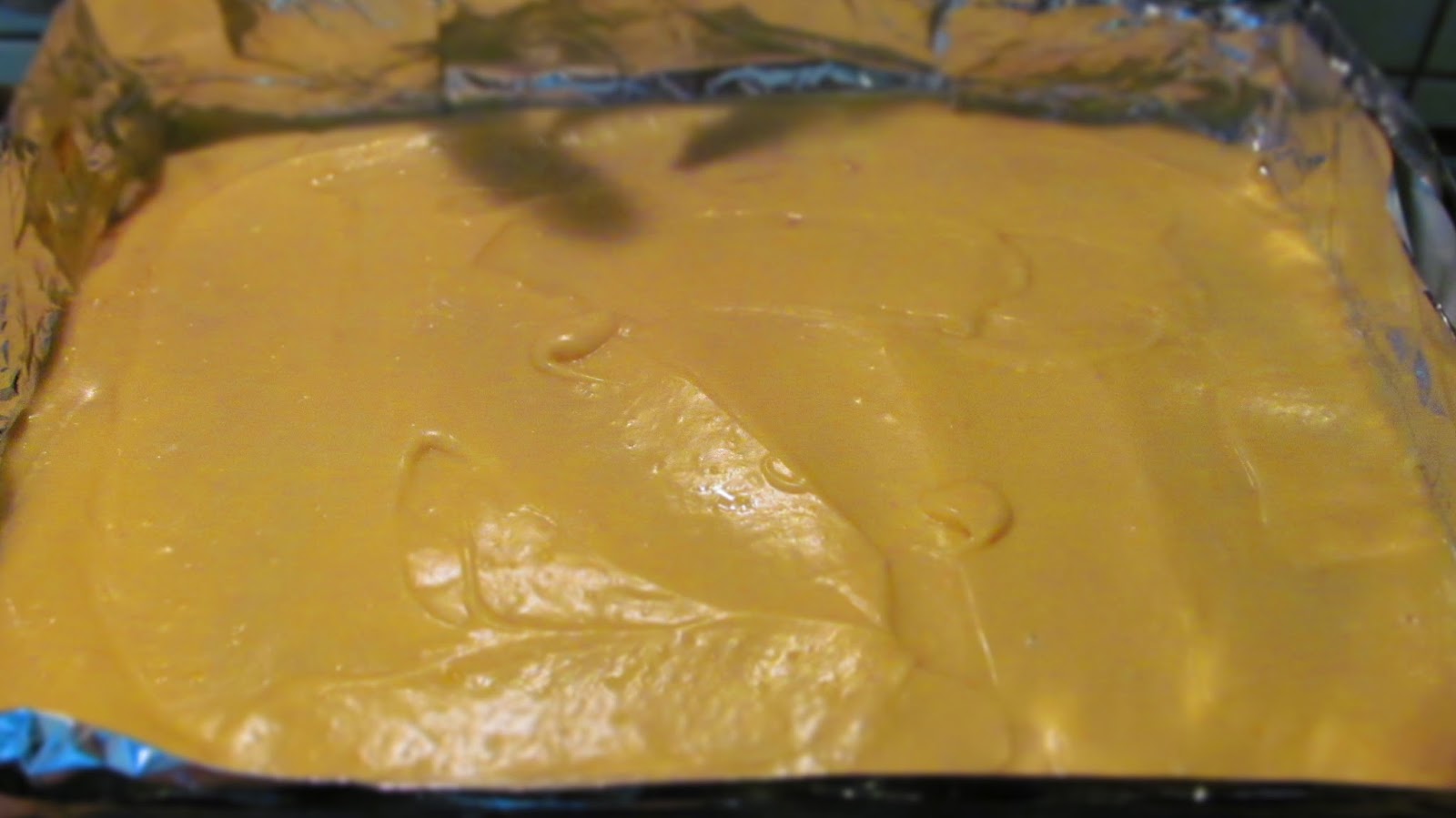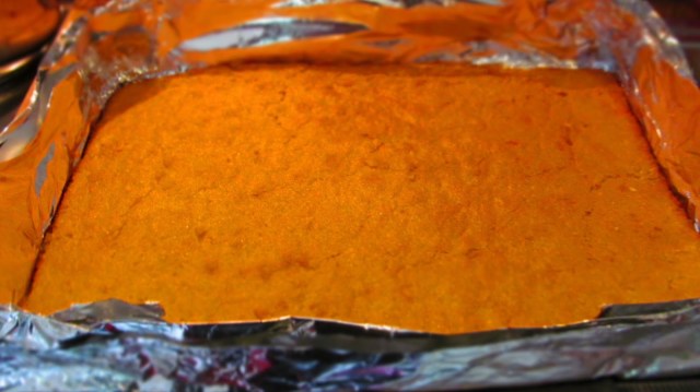 - Връщам отново в тавата и си правя по-високи стените на формата с алуминиево фолио. Ако разполагате с форма със свалящи се стени – още по-добре. Аз не разполагам с такава екстра и използвам фолио за оформяне на сладкиша.