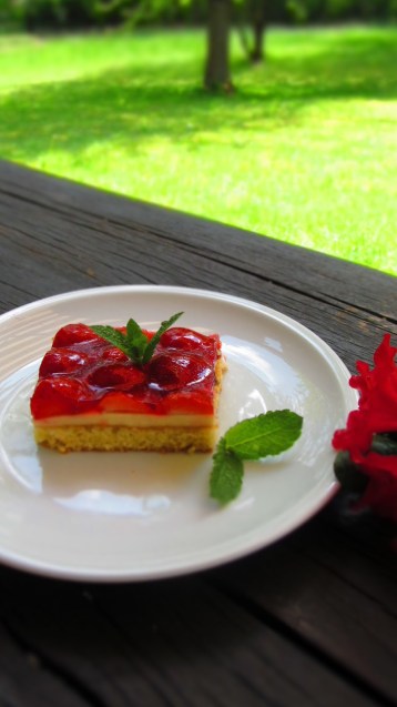 А … бе, немска му работа. Обичат си сладкишчета. Този ягодов сладкиш го направих скоро няколко пъти, защото моите немски приятели не успяват да му се насладят. Все не им достига. А пък за нас не е нещо особено. Не е торта! Ние обичаме да правим аткрактивни и много напоени сладкиши. Но пък този ягодов сладкиш, в съчетание с пудинг е красив и ненатрапчиво сладък.