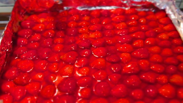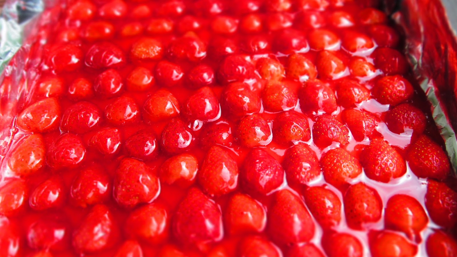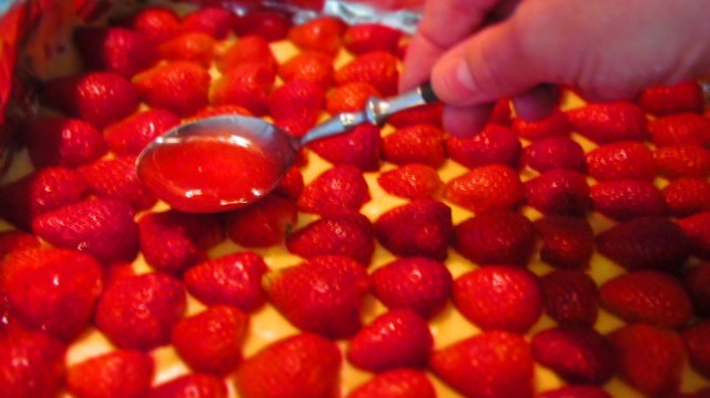 - Разпределям желатиновия фикс с лъжица върху ягодите.