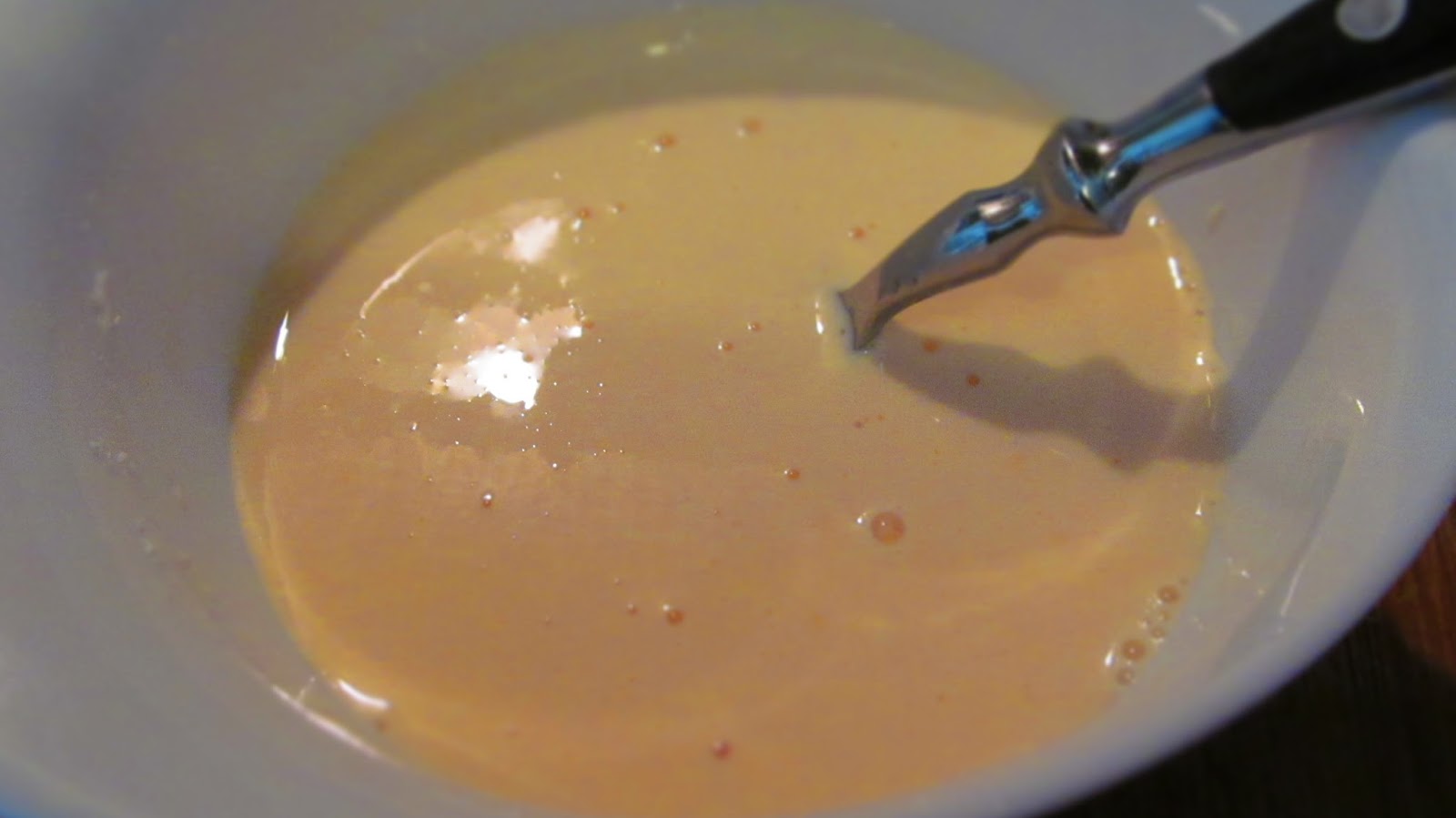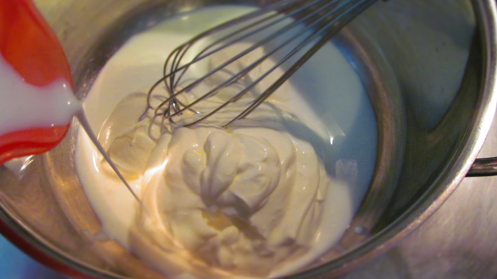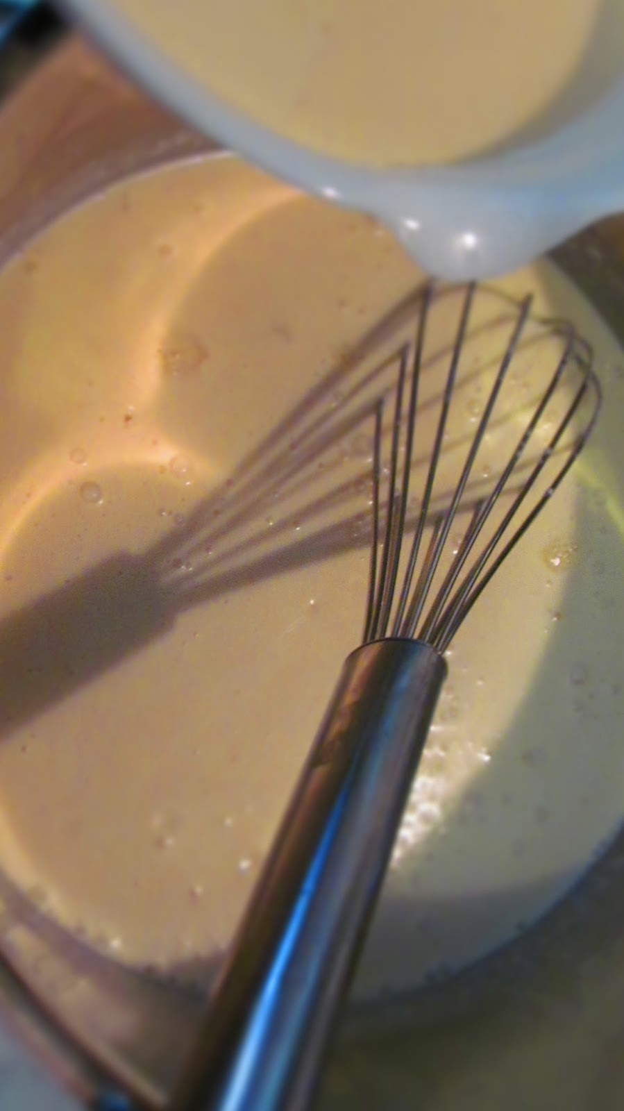 - Докато блатът изстива, подготвям пудинга според указанията на опаковката като смесвам мляко и крем фреш /той дава леко кисел вкус на пудинга/. Добавям захар и разбивам.