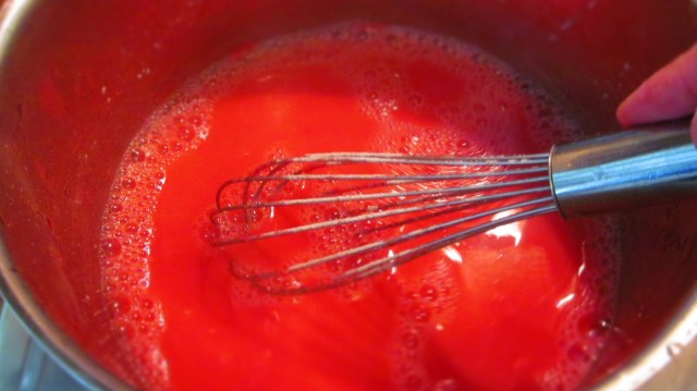 - Разтварям прахчетата желатин във водата и слагам на котлона със захарта да заврят.
