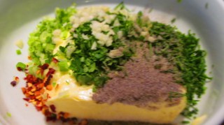 - Добавям всички зелени подправки, чесън и черен и лют пипер към маслото.