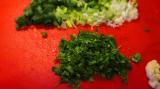 - Нарязвам зеления лук, чесъна и магданоза на ситно.