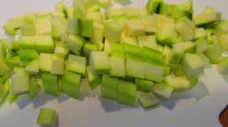 - Обелвам, измивам и нарязвам тиквичките на дребни кубчета.