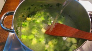 - Задушавам тиквичките, лука, чесъна и магданоза в мазнината за кратко.