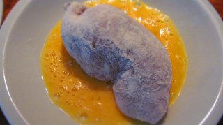 - Потопих в разбитото яйце и най-накрая овалях в галета.
