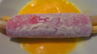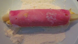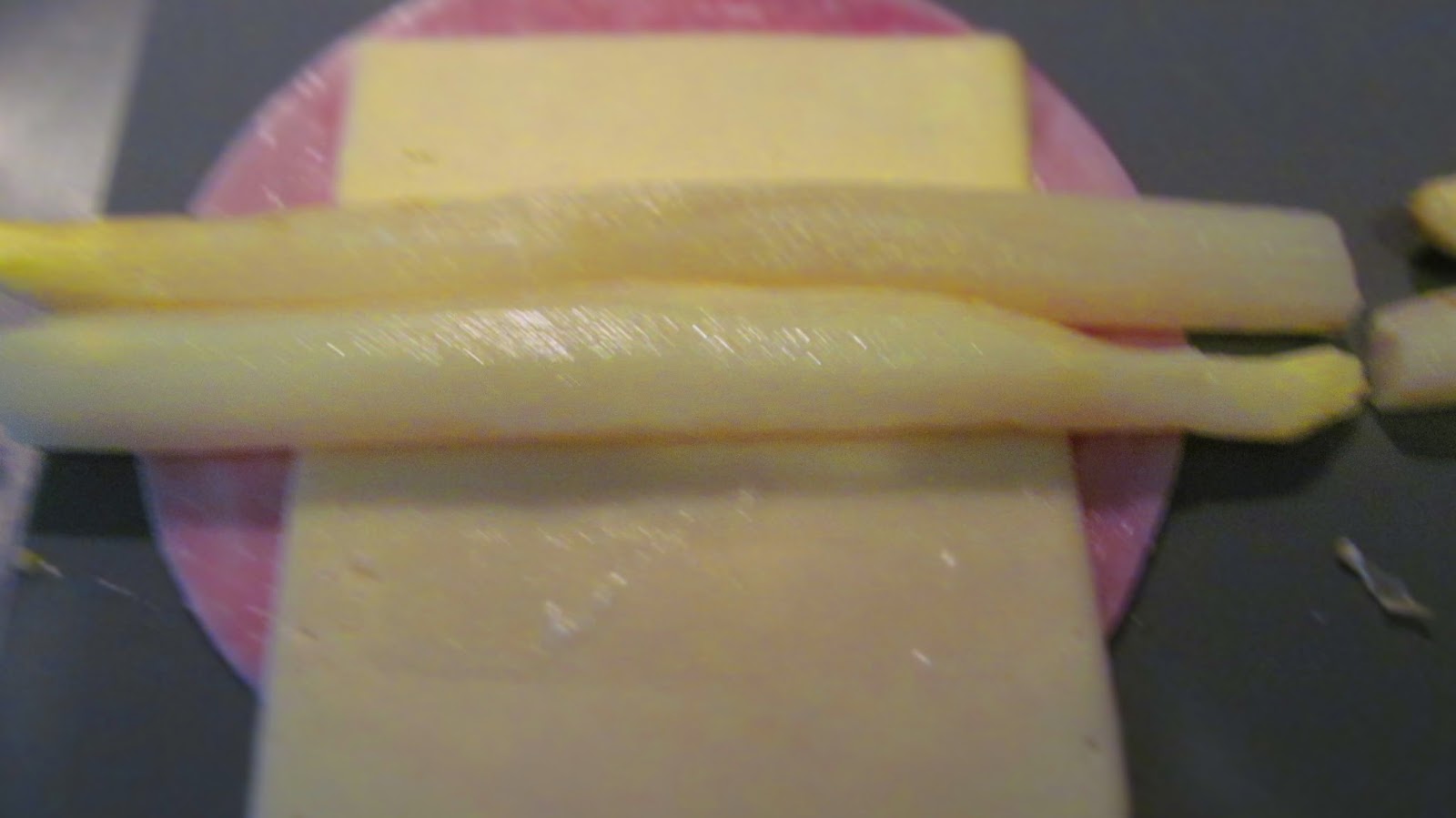 - Върху една шайба шунка слагам шайба кашкавал и две от сварените аспержи.