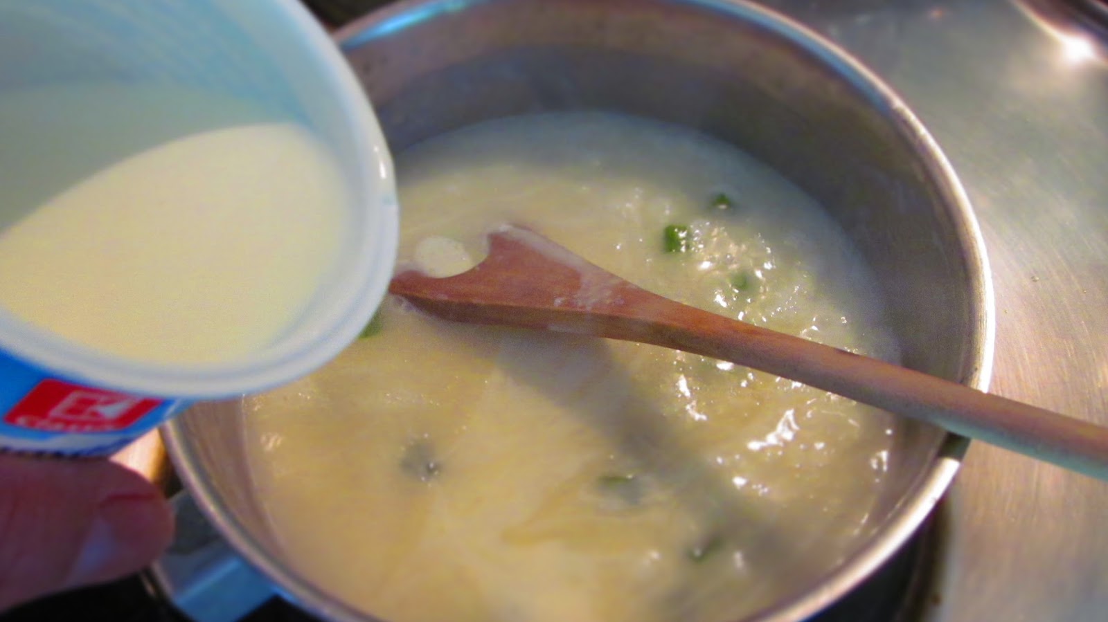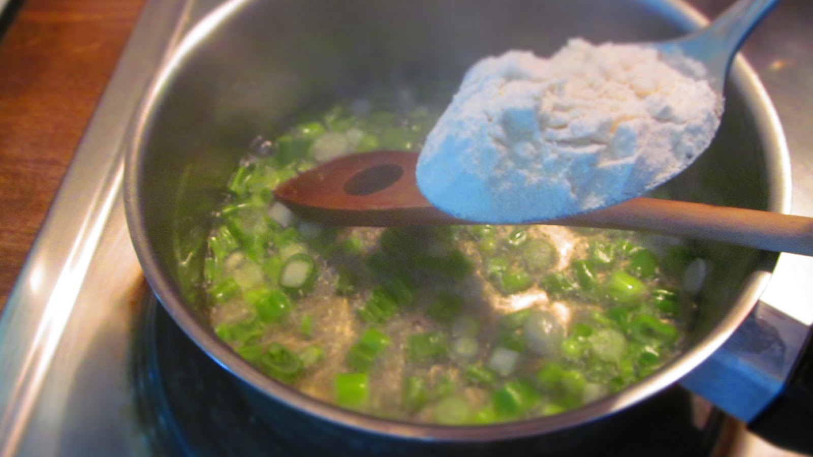 - Добавям две супени лъжици брашно, разбърквам и запържвам за кратко. Не бива брашното да потъмнява. Сосът трябва да остане светъл.