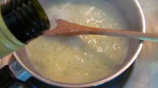 - Добавям бульона и бялото вино. Разбърквам.