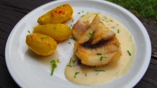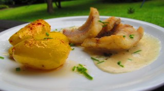 Сервирам рибните филета в затоплена чиния и върху ризлинг сос. Картофите, поляти с част от маслото са много подходяща гарнитура.