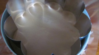 - Новата форма е без дъно и поради тази причина сложих хартия на дъното на 28 см форма за торта и вътре в нея сложих цветето.