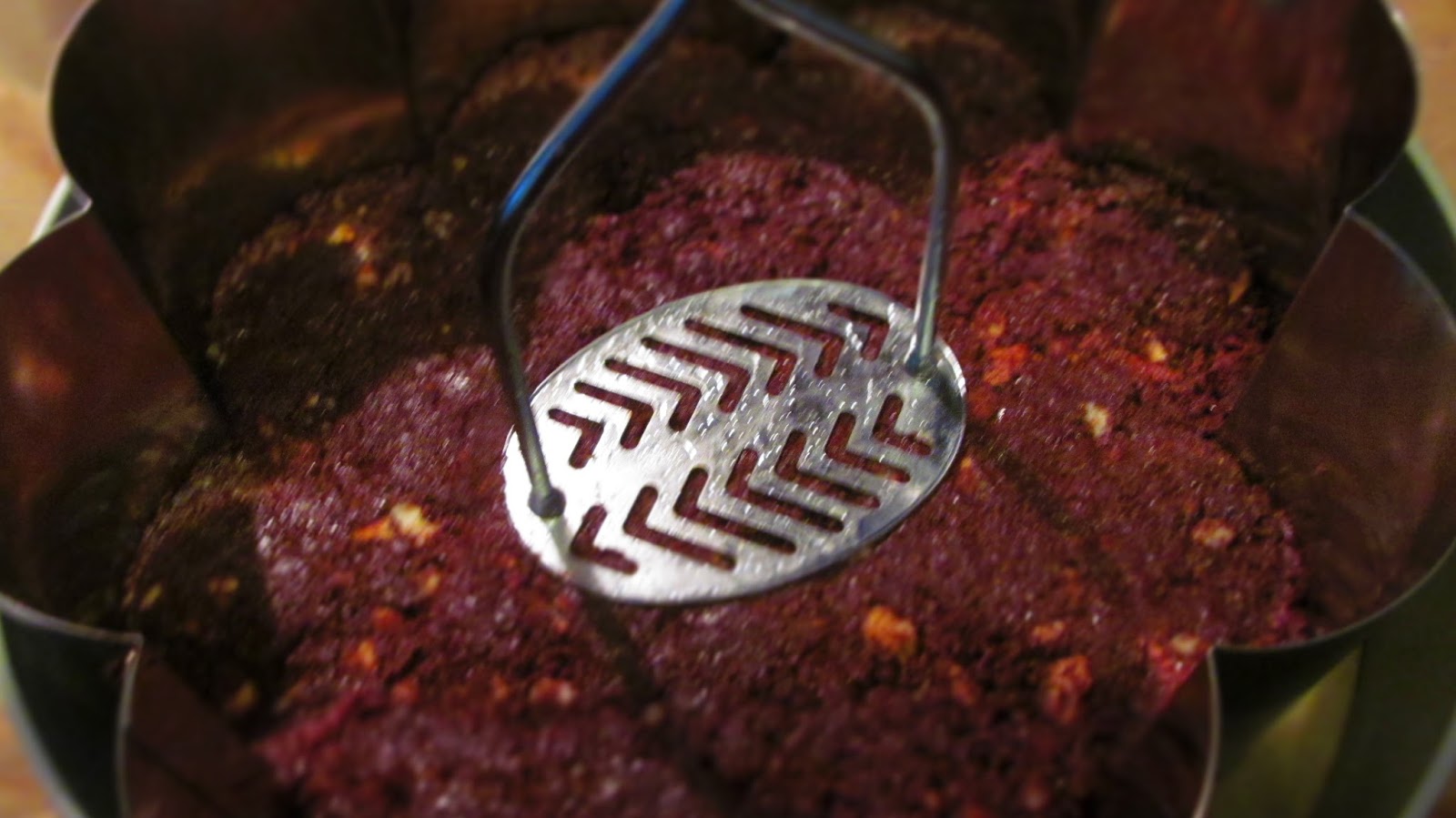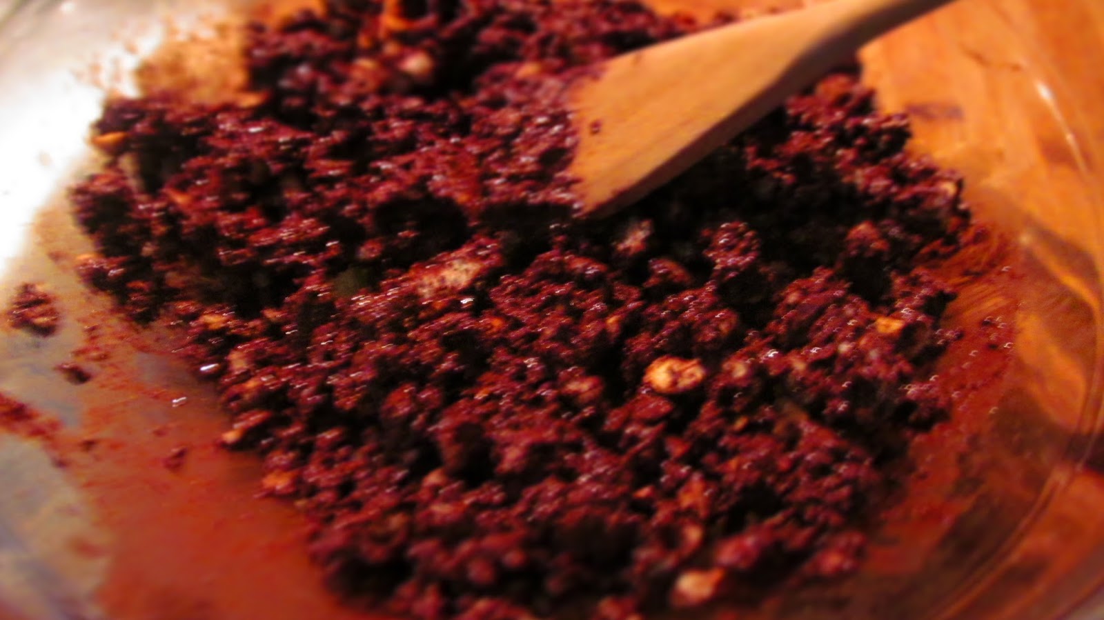 - Готовата смес изсипвам във формата и притискам много плътно за дъното. Слагам на студено за минимум 1 час да се стегне блатът.