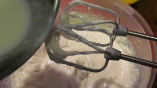 - Разбивам сметаната с ванилията и добавям към започналата вече да се желира смес. Разбърквам.