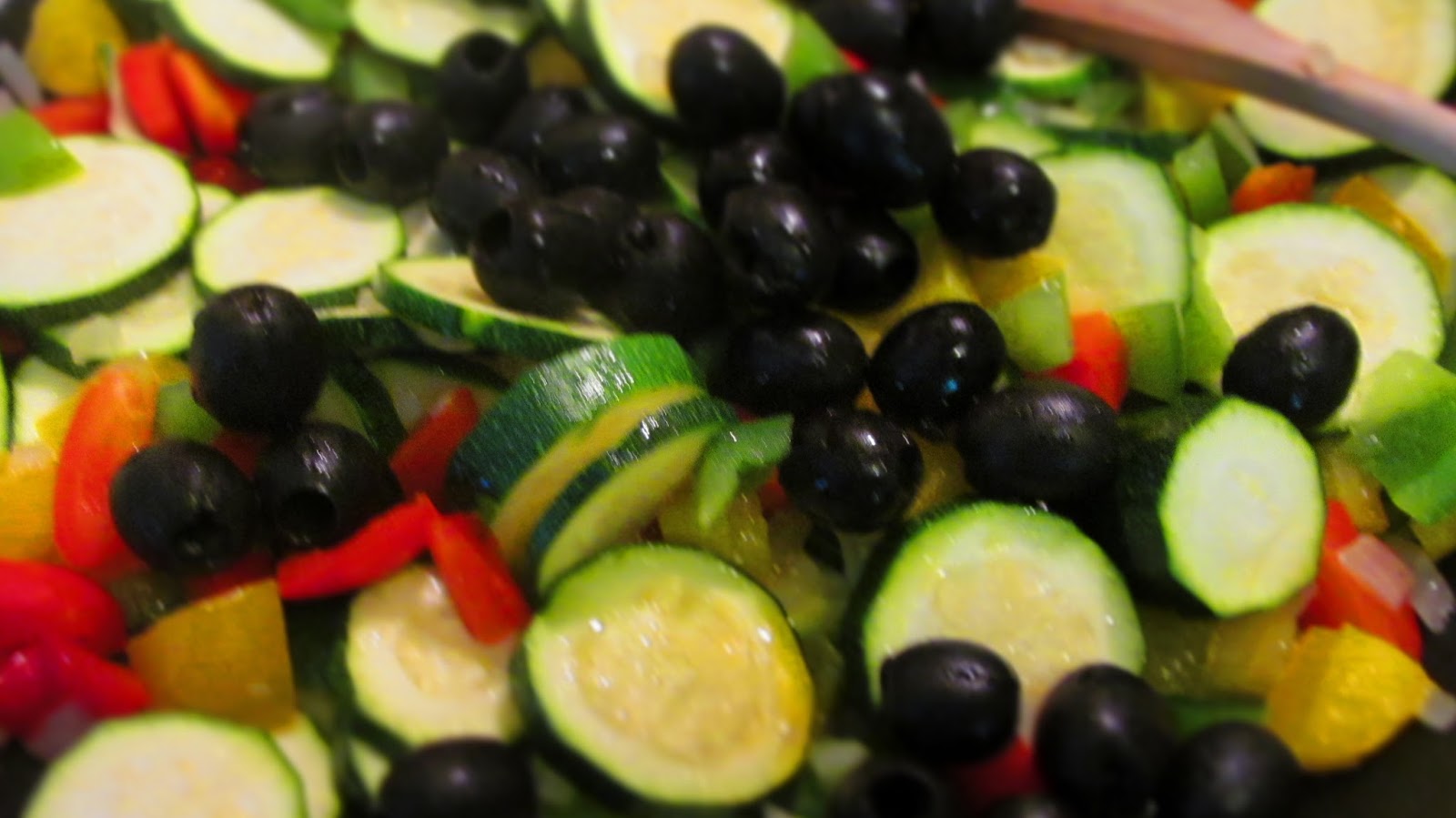 - Прецеждам маслините от саламурата и добавям към зеленчуците. Разбърквам.