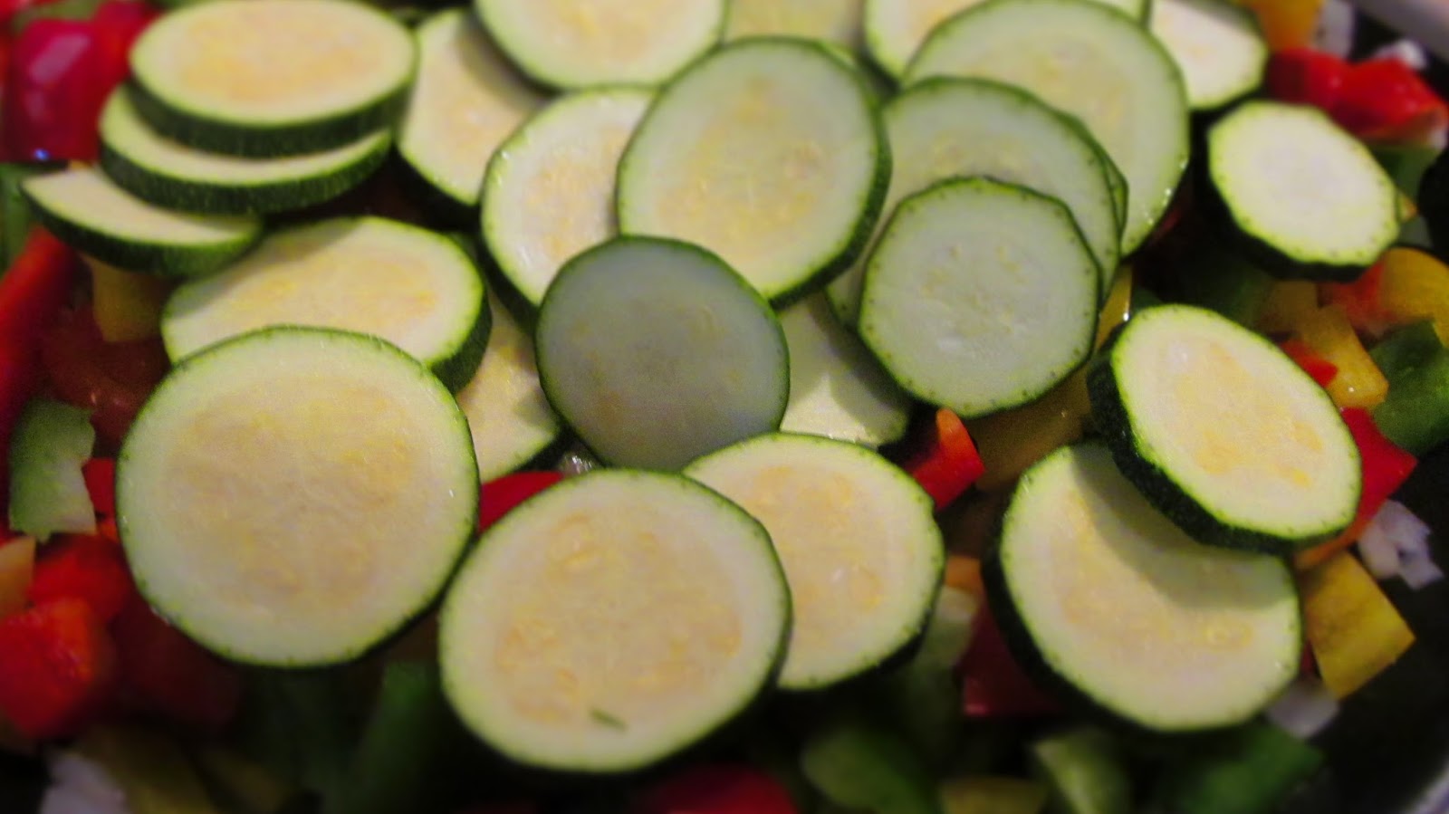 - Нарязвам тиквичката на филийки с дебелина около 5 мм и добвям към зеленчуците, за да се поизпържат за кратко.