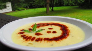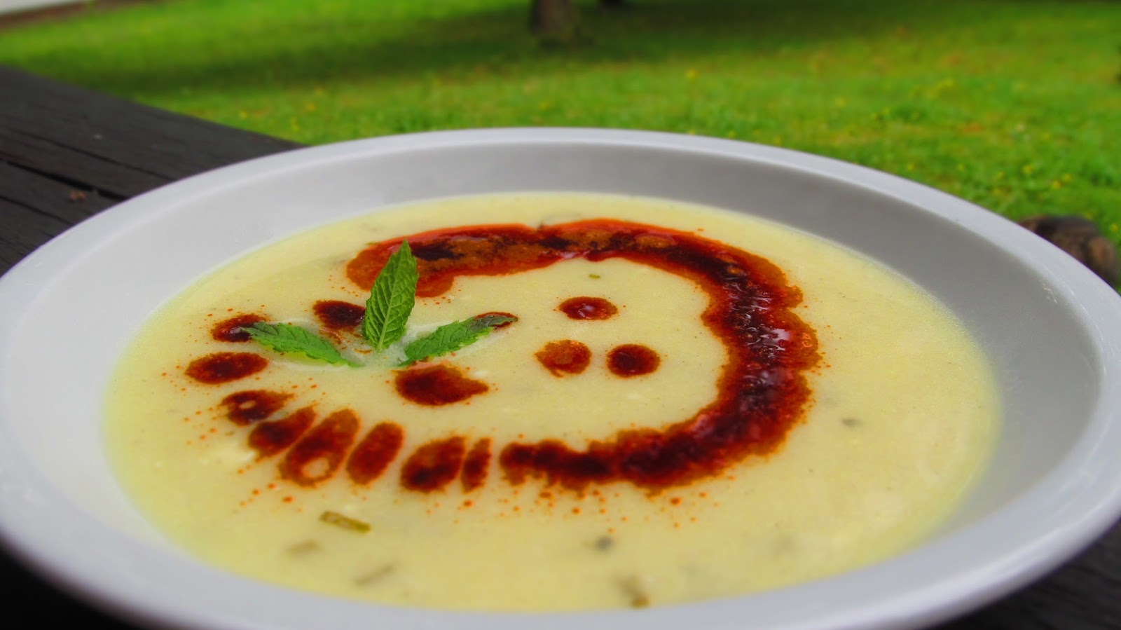 Сервирам супата гореща и декорирам с червеното масло и стрък мента.
