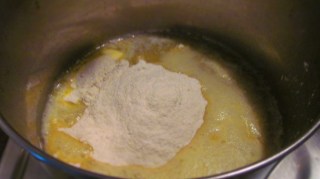 - Добавям брашното и запържвам за много кратко или докато ми замирише. Разбърквам непрекъснато с дървена лъжица, за да не залепне за дъното на тенджерата.
