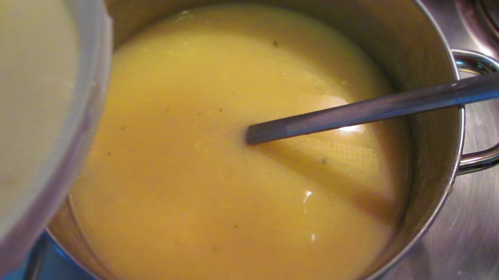 - Заливам с бульона и разбивам, докато се получи гладка смес. Намалявам котлона на най-ниската температура и оставям супата да къкри. Разбърквам от време на време.