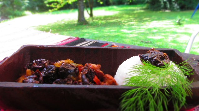 От всички рецепти, които прочетох за този тип яхния в моите български кулинарни книги, разбрах, че като зелена подправка подходяща за сини сливи се използва магданоз или копър. Вие ще вземете решението коя да добавите. Аз лично се спрях на магданоз, но ще пробвам и с копър следващ път.