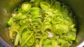 - Почиствам и измивам празия лук. Нарязвам на тънки колелца и го сварявам за около 30 секунди /бланширам/ в 300 мл подсолена вода. Прецеждам и оставям да се оцеди. Запазвам част от водата.
