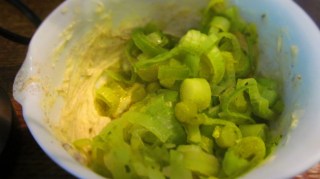 - Добавям лимонов сок и 4 с. л. от празия лук. Разбърквам.