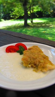 В чиния сипвам малко сметанова пяна, добавям рибата и декорирам с доматче.