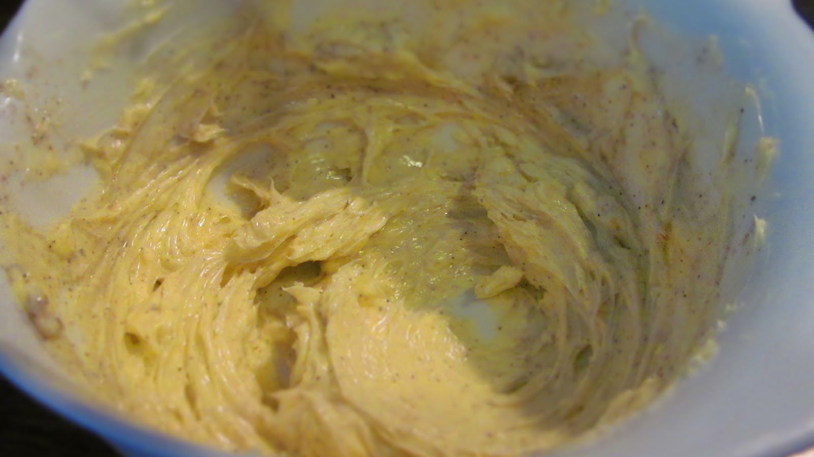 - 40 гр от мекото масло подправям със сол и черен пипер и разбивам до пухкав крем.
