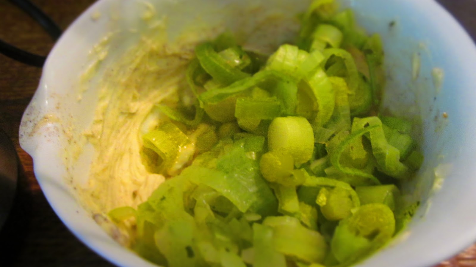 - Добавям лимонов сок и 4 с. л. от празия лук. Разбърквам.