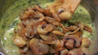 - Почистих и измих спанака. Нарязах на едро и с нарязания на ситно пресен лук задуших в 1 с. л. олио само до омекването му. Тук добавям и джоджена.