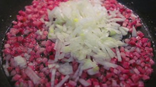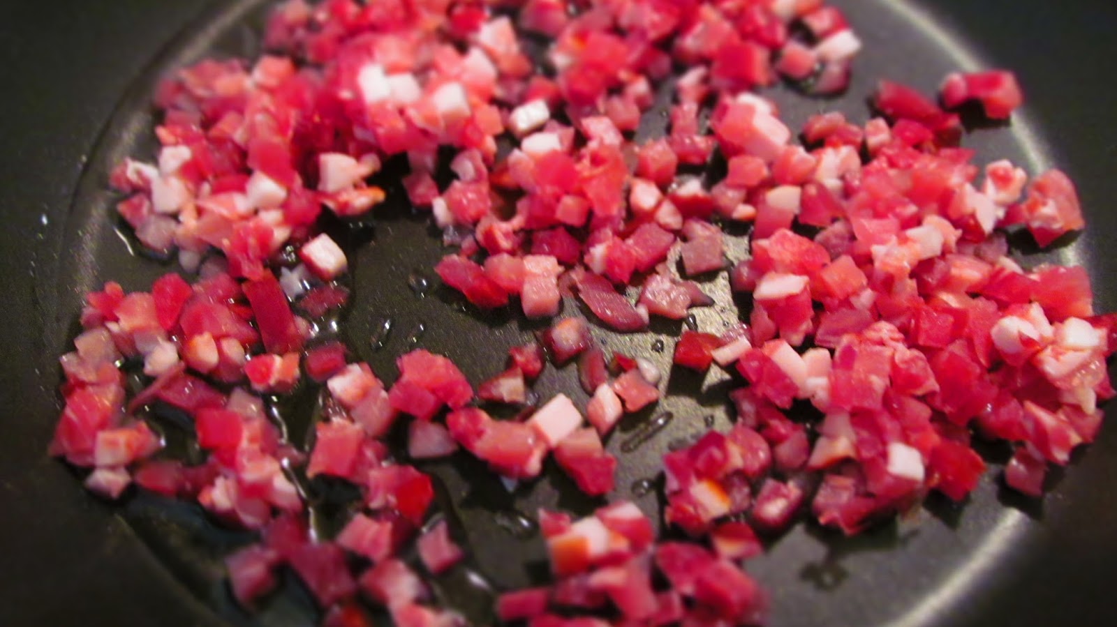 - В тиган загрявам олиото и изпържвам за кратко нарязания на ситни кубчета бекон. Пърженето продължава само докато усетя ароматът му.