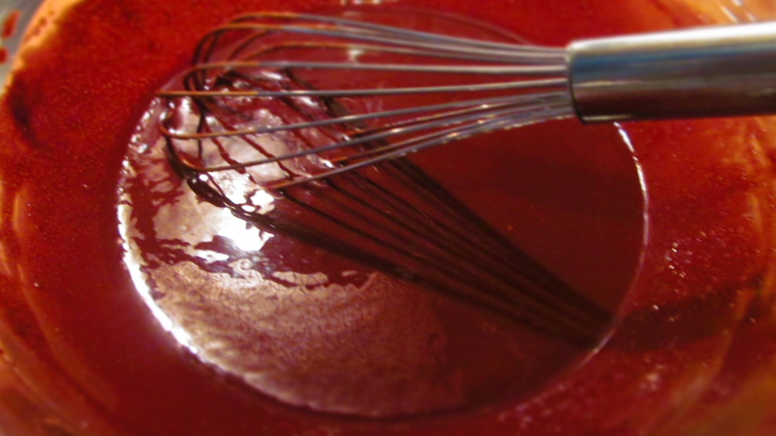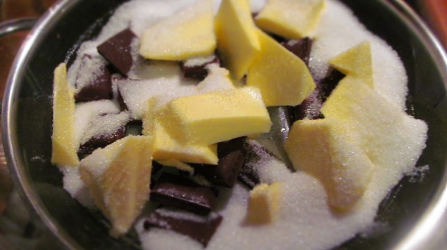 - В стъклена купа смесих шоколада, маслото и захарта. Сложих върху тенджера с вода, но така че да не потъва дъното на купата във водата. Включих котлона на максимална мощност.